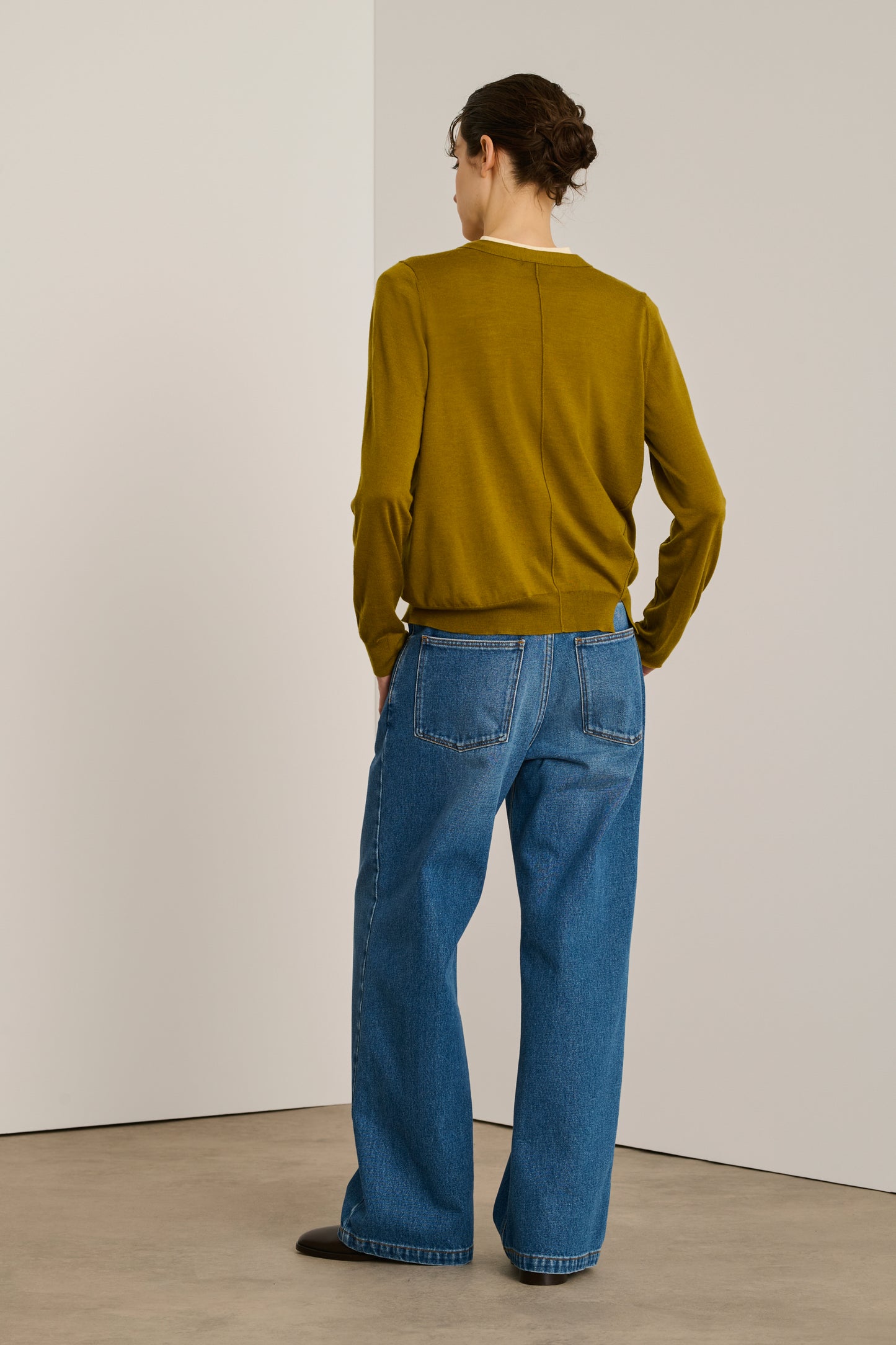 ALYSSA es un cárdigan holgado con un amplio escote en V. Está tejido en una lana merina extrafina para llevar directamente sobre la piel. La asimetría en la parte inferior del cuerpo, las disminuciones, los acabados de canalé y las costuras invertidas son detalles que enriquecen este cárdigan falsamente clásico.