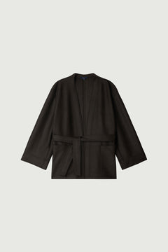 GIBSON es un pantalón de lana afieltrada color verde ébano, de corte amplio y redondeado. Sus bolsillos italianos y ribeteados, así como las pinzas en las rodillas, destacan su estilo. La lana densa y flexible garantiza una silueta elegante.