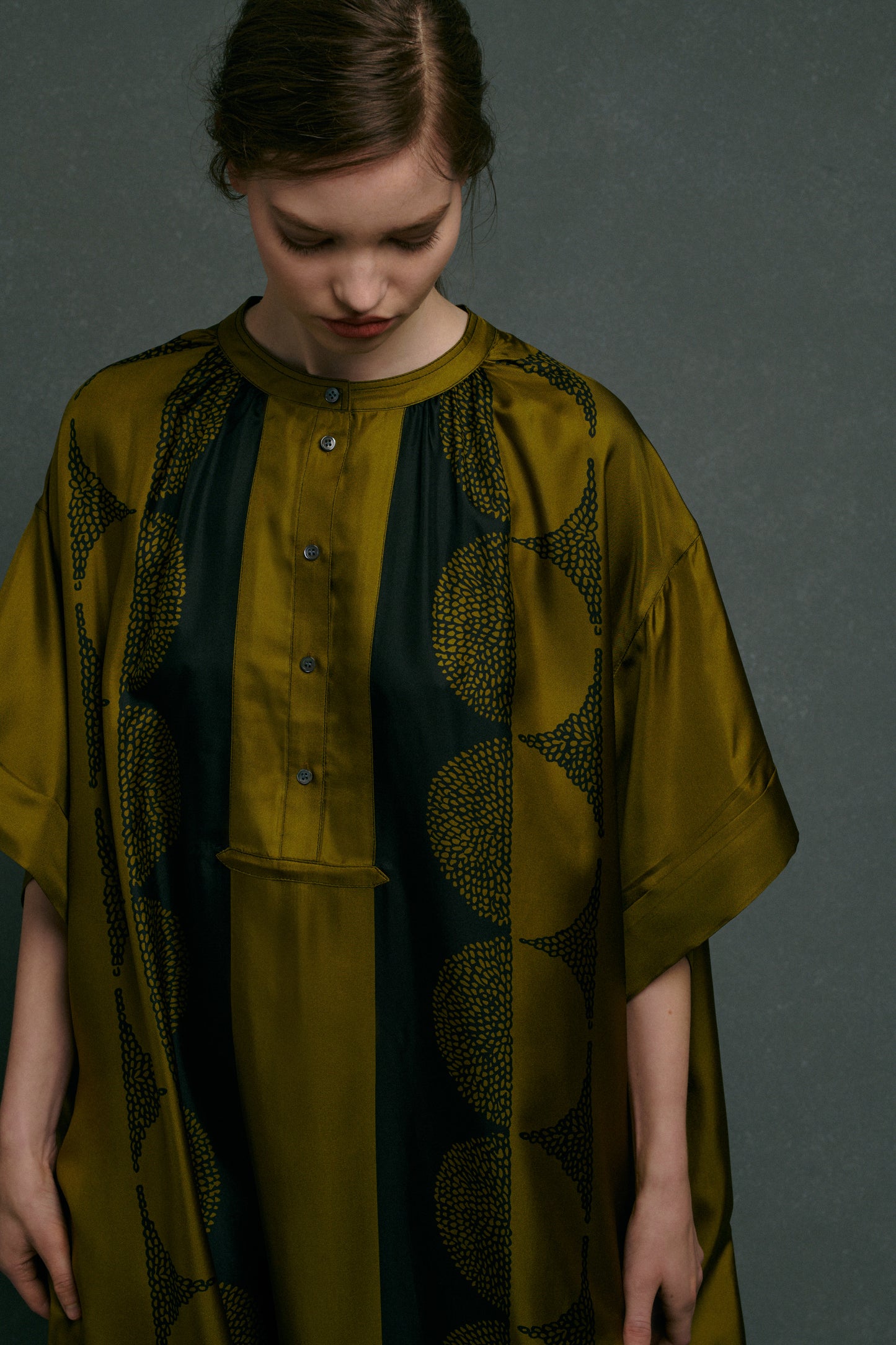 Vestido largo de manga corta en sarga de seda estampada «Pochoir» caqui/negro