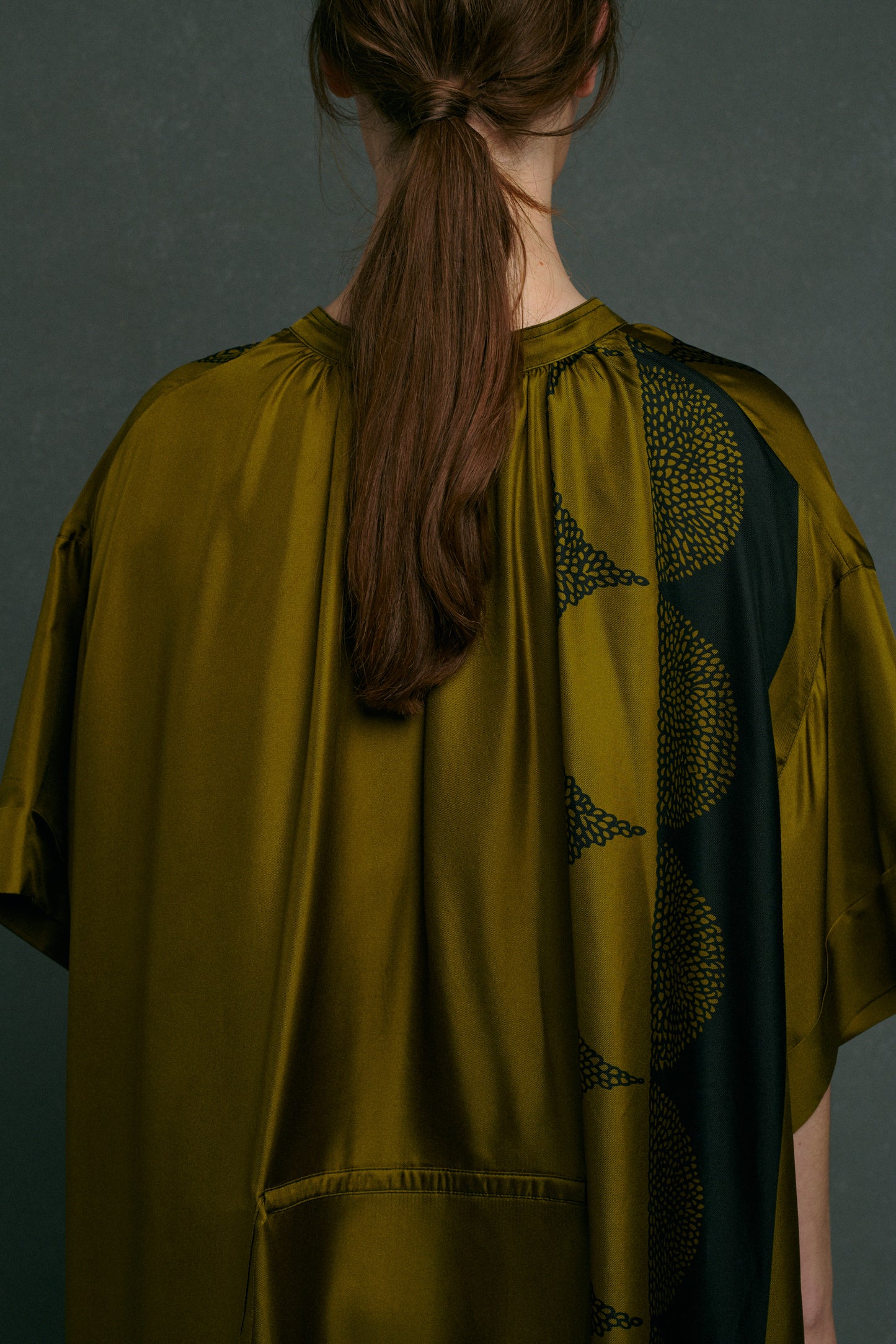 ATHENA es un vestido largo de sarga de seda. El efecto de los frunces en el cuello y su pechera frontal le proporciona relieve y personalidad. Un cinturón sujeto en la parte trasera permite acentuar la cintura. El estampado "Pochoir" resalta con brillantez en este vestido sofisticado y elegante.
