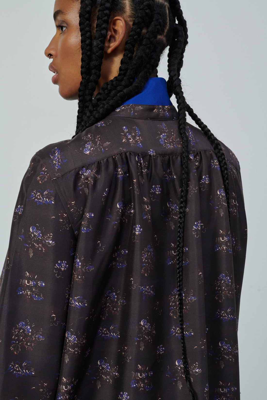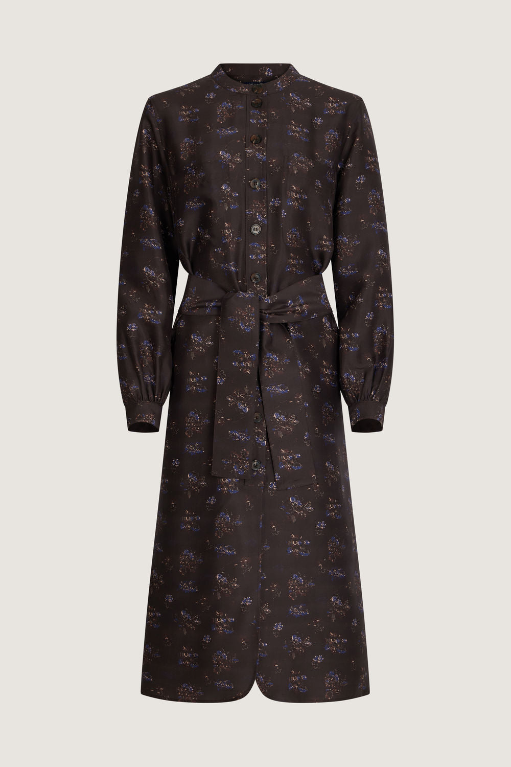 Vestido de seda de Dupioni estampada - Vestido largo y volumen recto, se puede llevar con o sin cinturón- Manga larga con puño abotonado- Escote redondo y cierre de botones en la parte delantera- Parte inferior de la prenda en forma de camisa- Cinturón desmontable