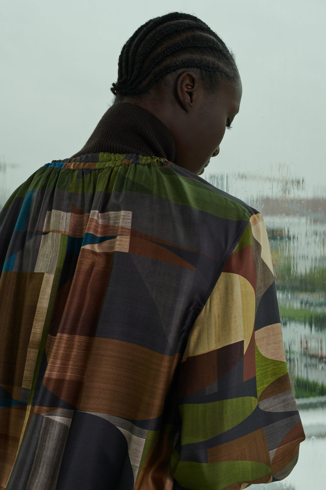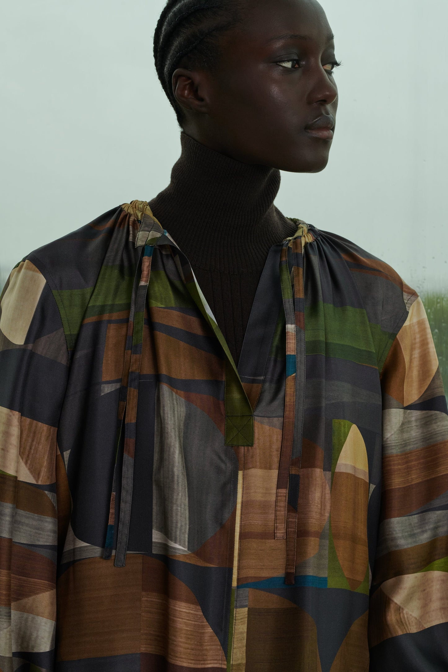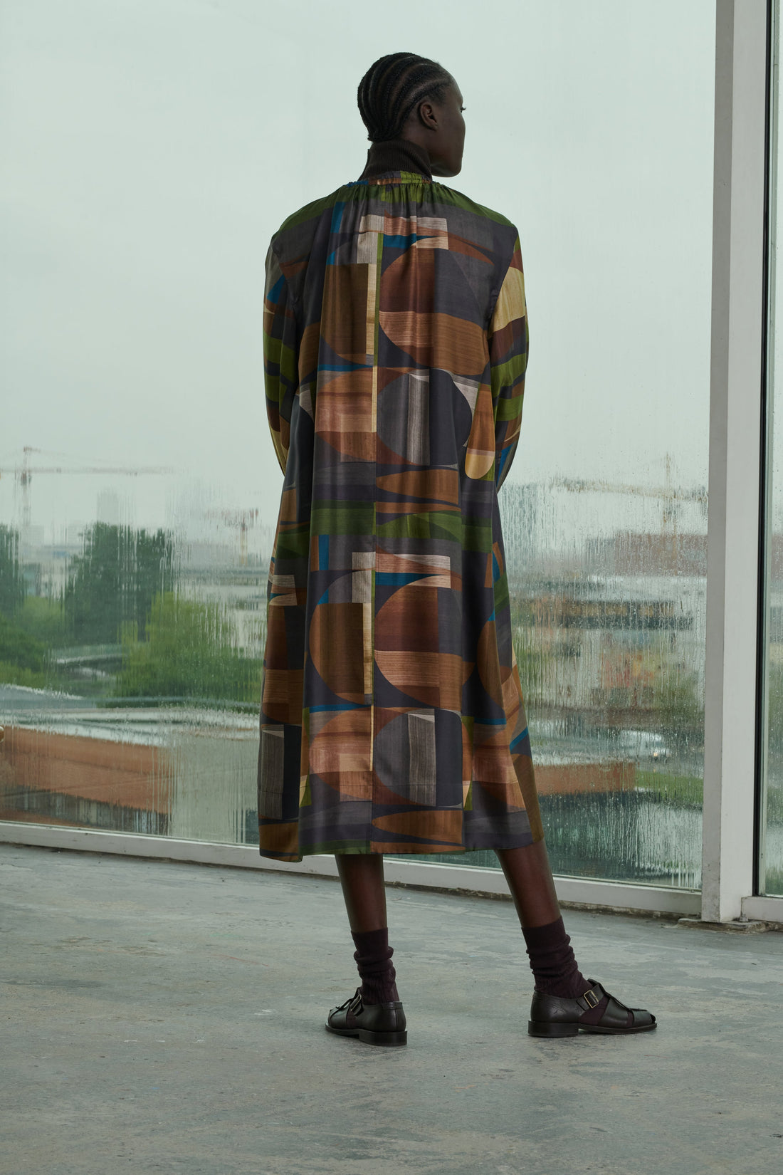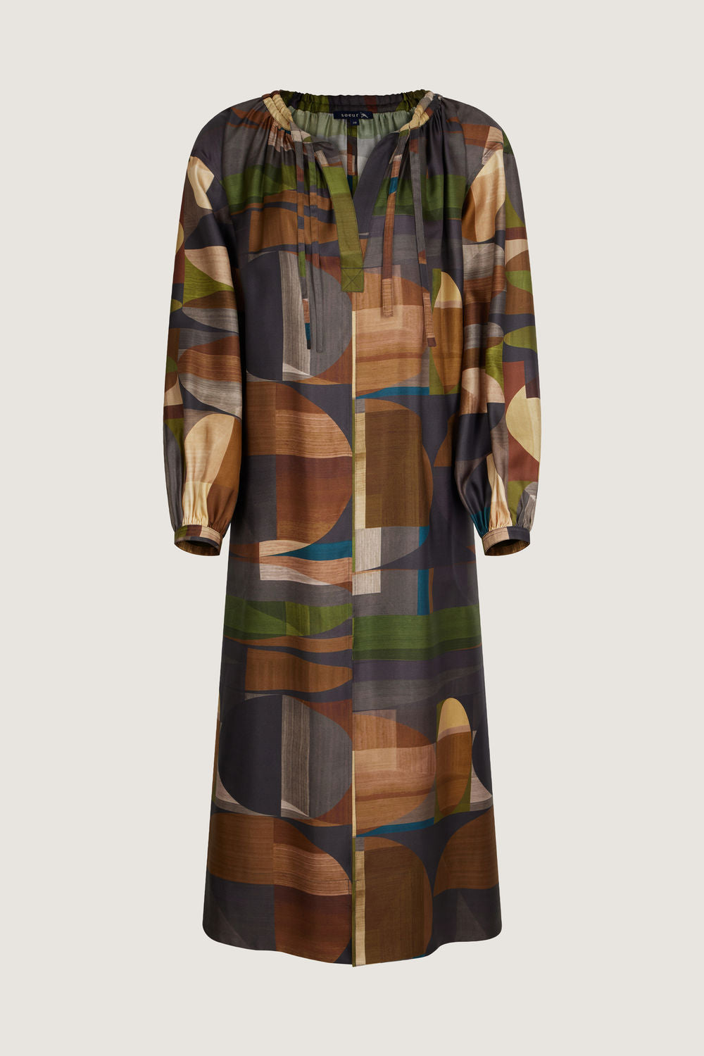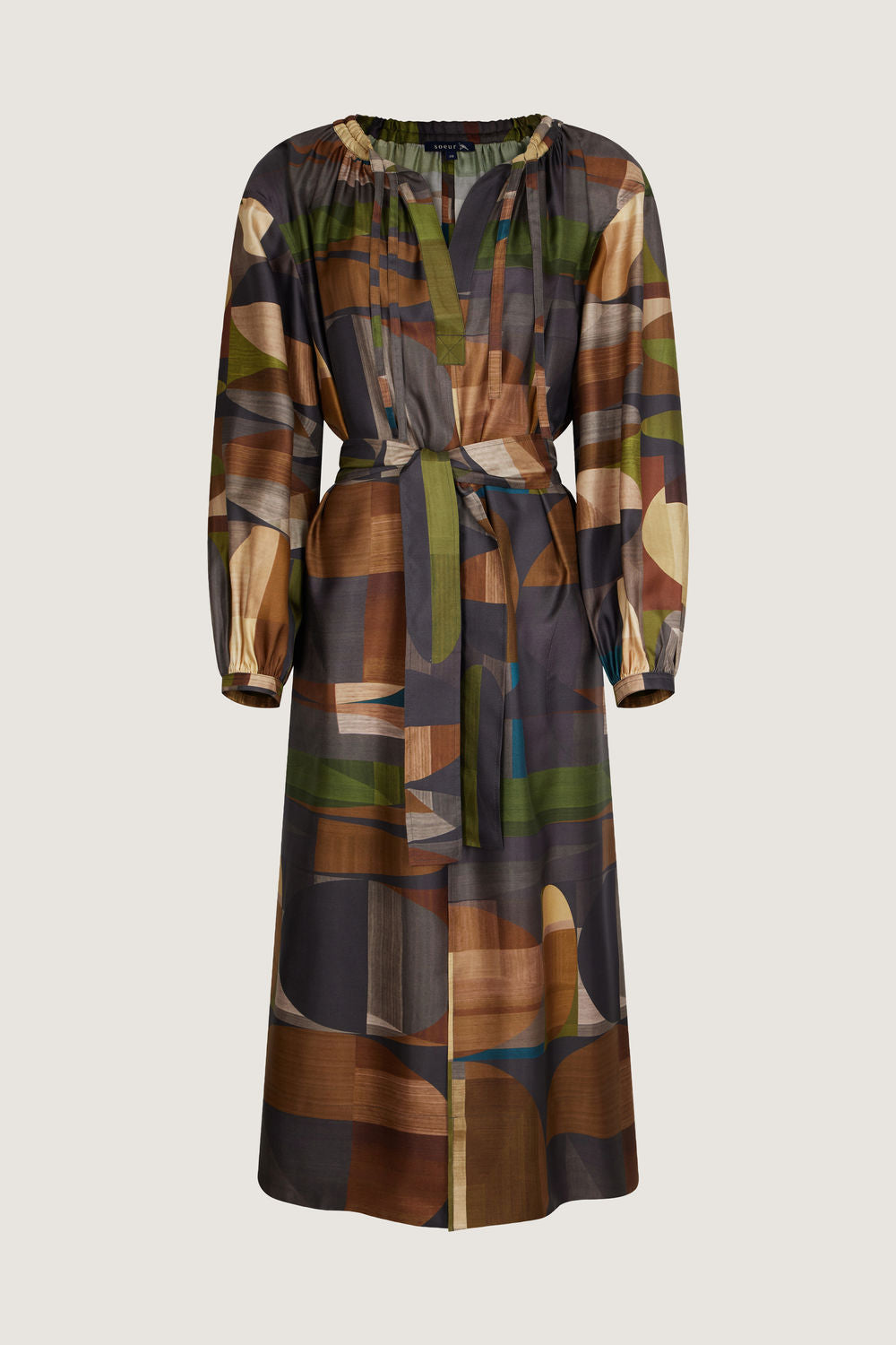 Vestido amplio de sarga de seda estampada verde/marrón